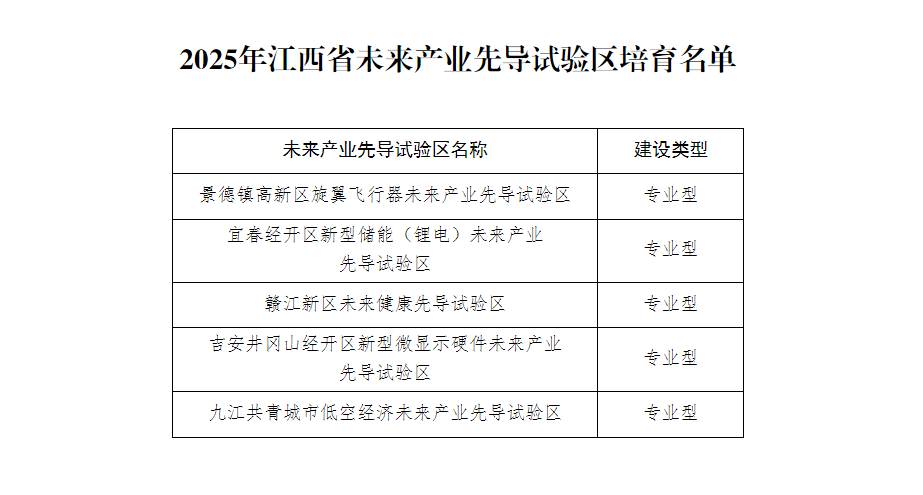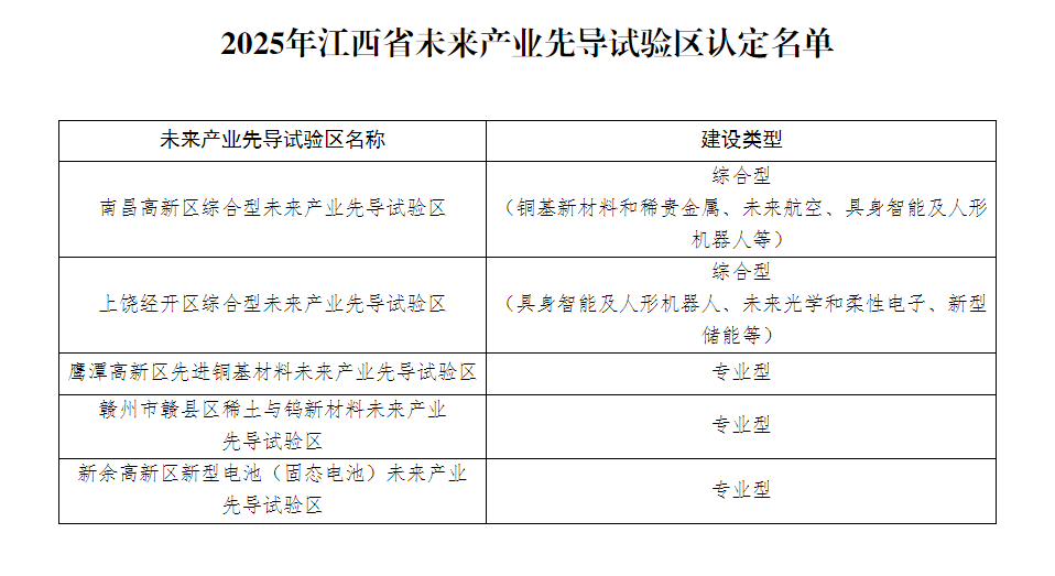 大江新闻讯 江西日报全媒体记者陈晖报道:近日,省工业强省建设工作领导小组办公室公布2025年江西省未来产业先导试验区认定与培育名单,南昌高新区综合型未来产业先导试验区等10个未来产业先导试验区入选,涉及铜基新材料和稀贵金属、未来航空、具身智能及人形机器人等多个领域。