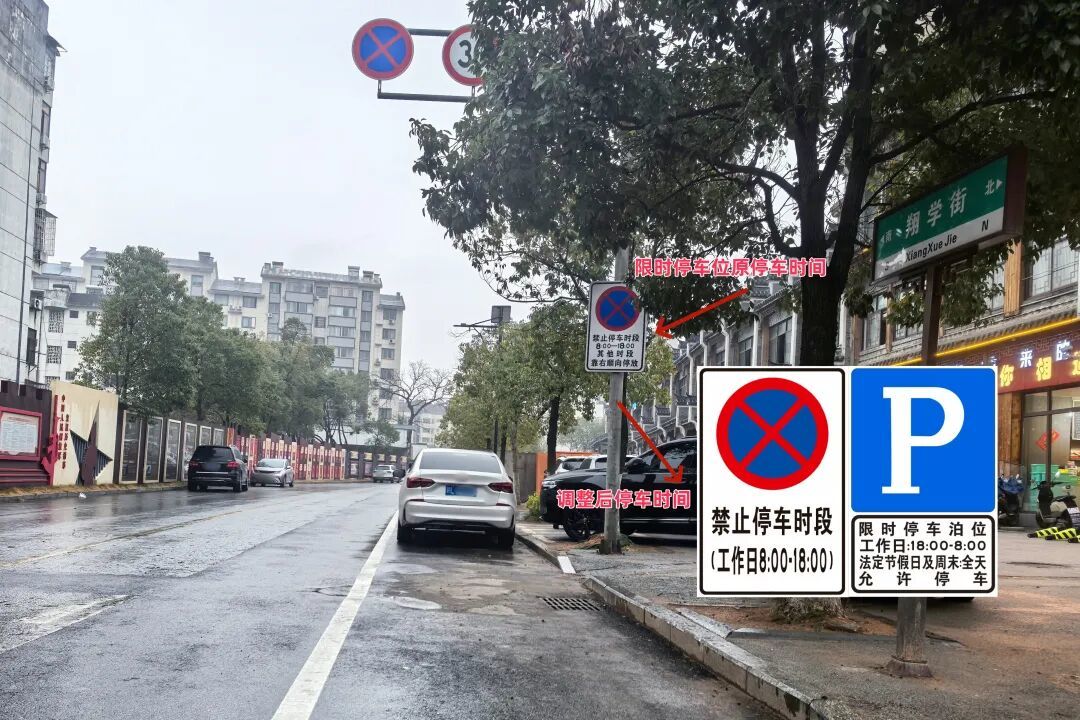 翔学街紧邻学校、社区及商业区,工作日早晚高峰车流量大,原有限时停车位主要满足接送学生需求;而周末及节假日期间,路段车流量锐减。鹰潭交警通过实地调研、数据分析,发现该路段节假日停车需求激增,周边居民、购物人群常因“一位难求”困扰。为此,支队决定将原限时停车位调整为“节假日弹性停车位”,实现道路资源从“时段性利用”向“全时段共享”转变。