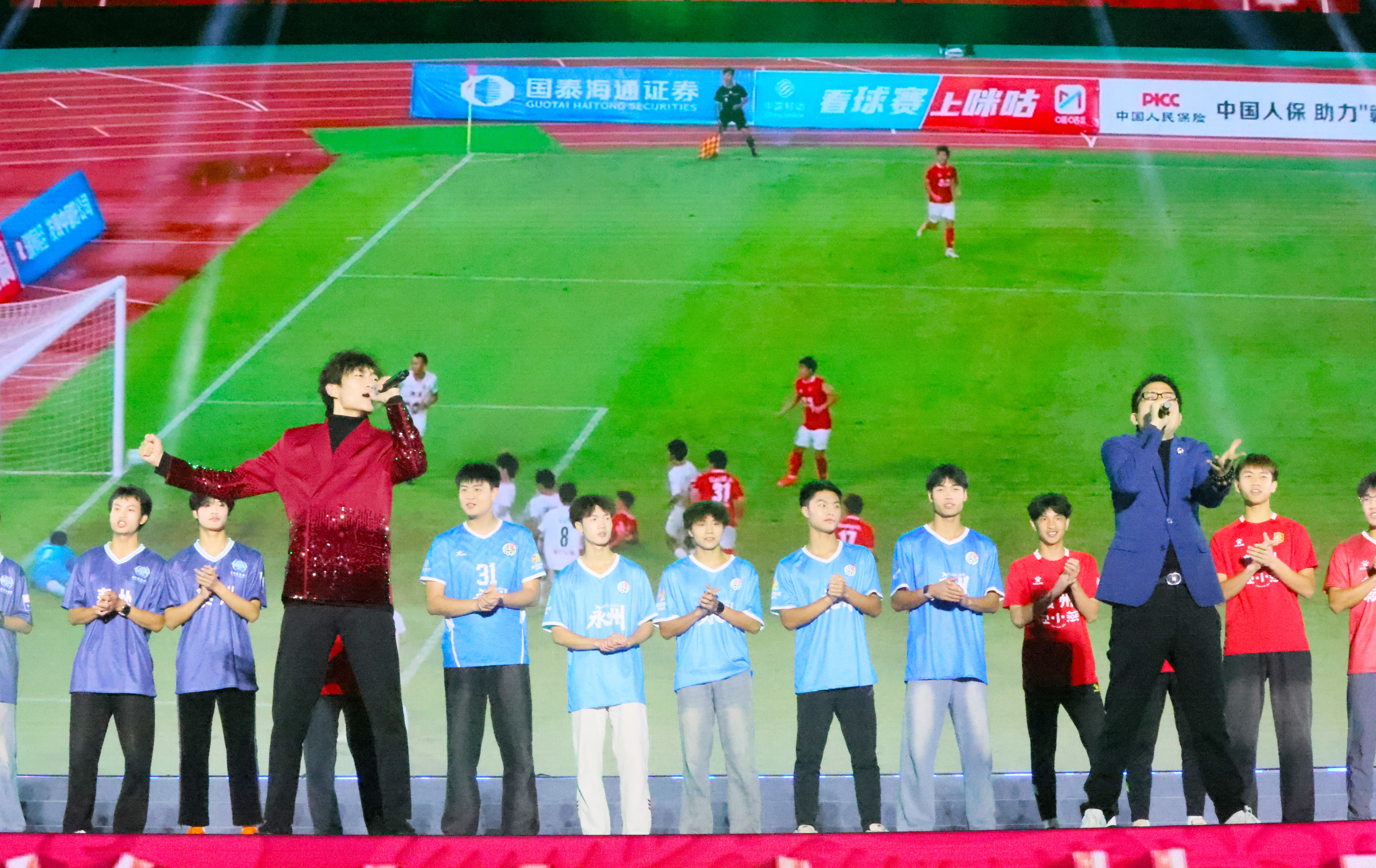 袁树雄(右)携儿子袁旦,邀请了“苏超”冠军的泰州队的部分球员,“湘超”冠军的永州的部分球员,“赣超”冠军的赣州队的部分球员演唱歌曲《太勇敢》。