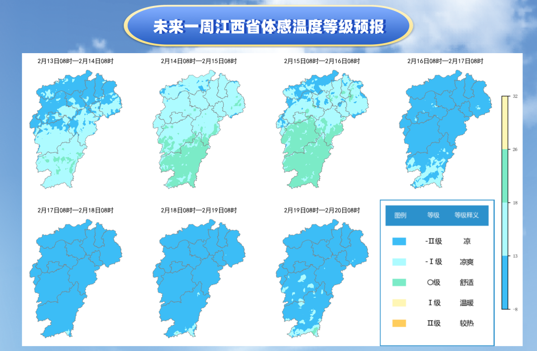 其中:15日起全省自赣北向南开始降温,16—18日气温较低,风力普遍增强,风寒效应显著,全省自北向南体感温度将陆续转为最冷等级“凉”,体感比气温更冷,早晚时段寒意会更加明显。