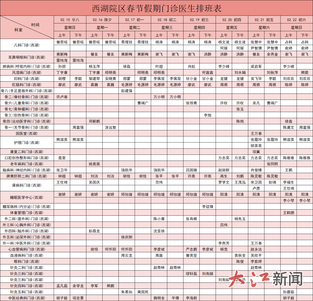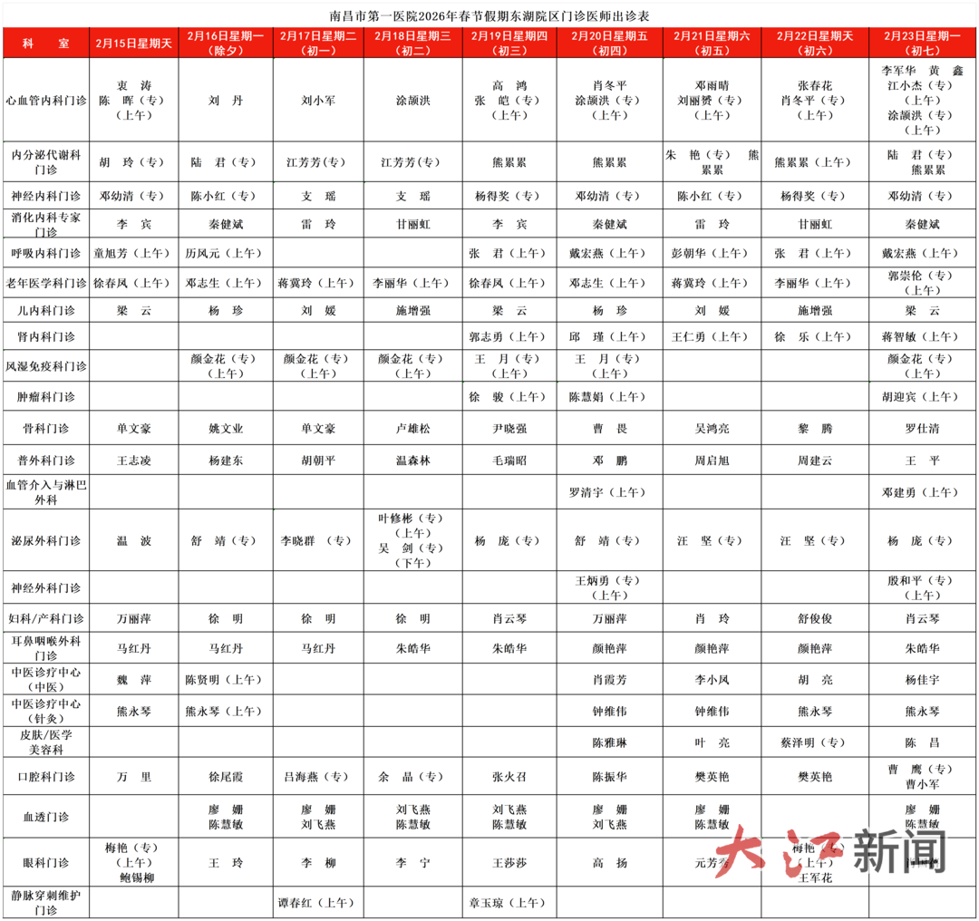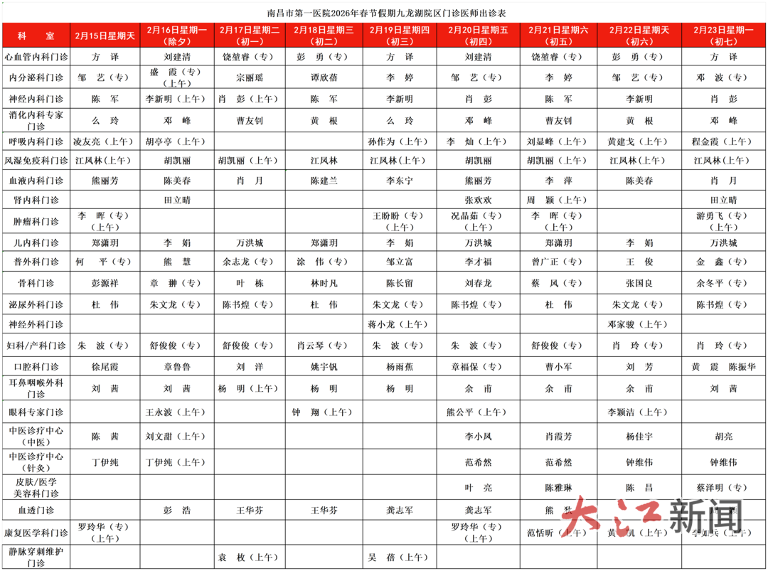 大江新闻讯 全媒体记者杜宇蔚、实习生温楚云、王能俊报道:2026农历马年春节临近,为保障市民春节假期就诊需求,大江新闻第一时间整理了南昌各大三甲医院的门诊值班安排。从腊月二十九到大年初七,哪家医院开诊、哪些科室停诊,这份指南为您逐项厘清。收好这份“健康守岁”清单,帮助春节期间有就医需求的家人、朋友不跑空。