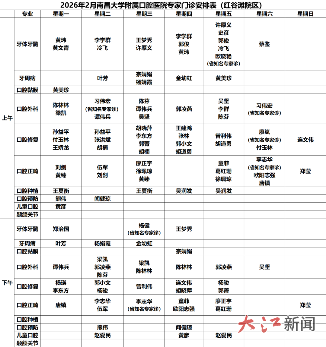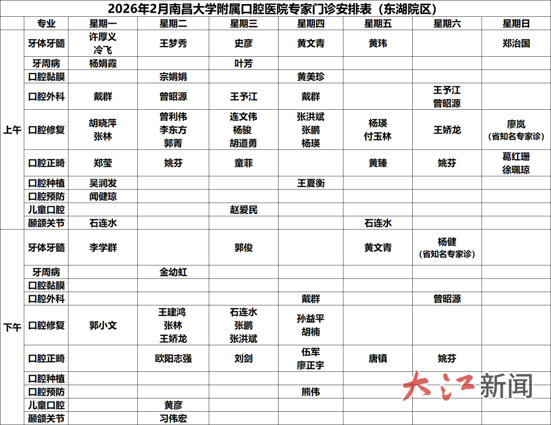 2月16日—19日,东湖院区、红谷滩院区与世贸路门诊部门诊停诊,红谷滩院区一楼的口腔急诊科24小时接诊,需要紧急治疗的患者请前往红谷滩院区口腔急诊科就诊。2月15日、20日—23日,全院门诊按双休日排班正常开诊(上班时间8:00-12:00,14:00-17:30,错峰门诊不开诊。2月24日起全院正常开诊。