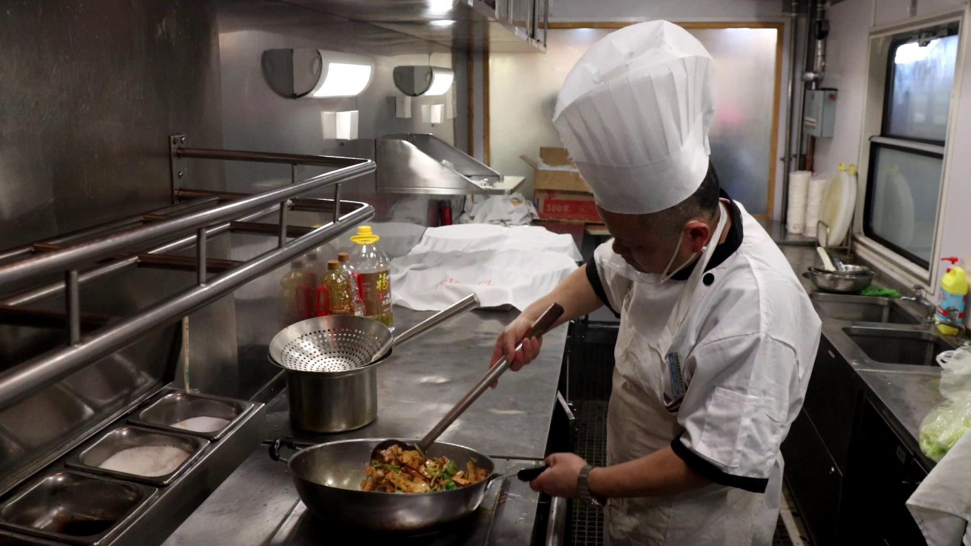 在餐车一头的厨房里,列车主厨夏国顺,熟练地起锅烧油,倒入配好的食材,几勺佐料再经几番颠勺,一道热辣鲜香的辣椒炒肉就出锅了。