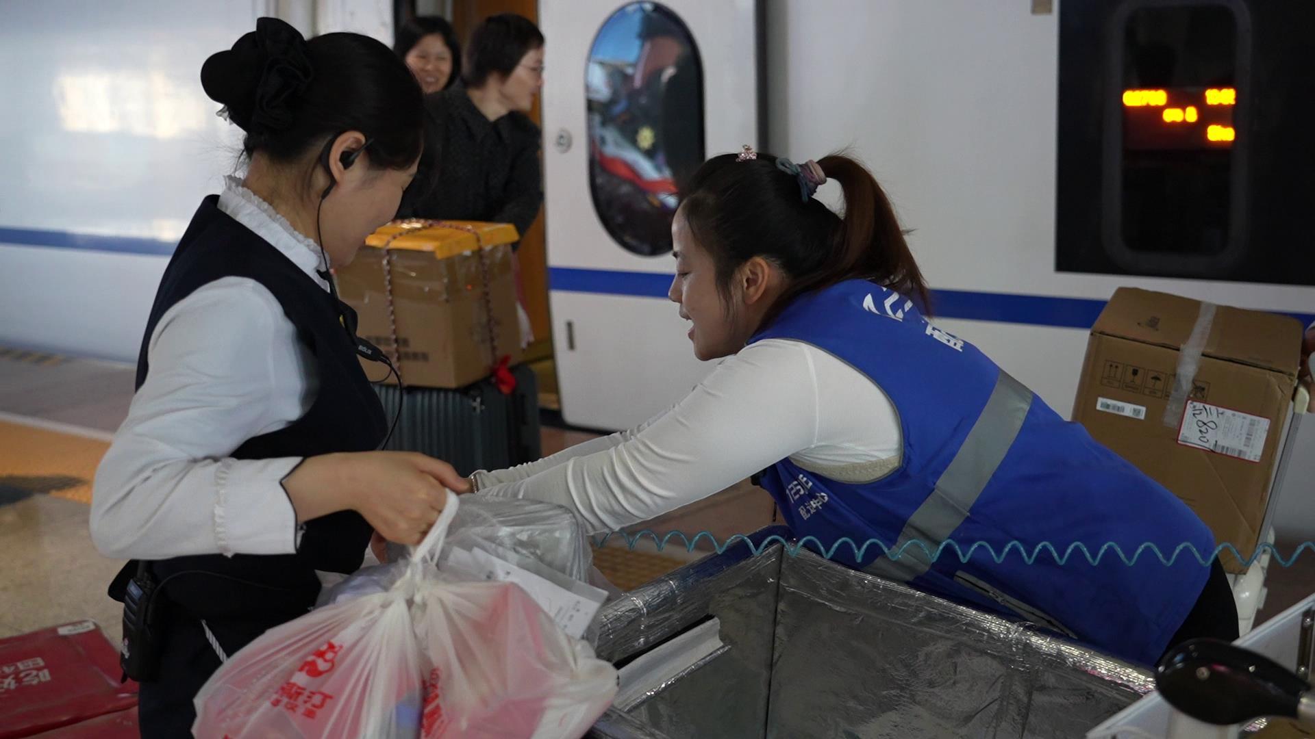 送完G336次列车的全部餐食,熊虹微微喘着气。她告诉记者,这是她从事高铁配送服务的第三个年头。刚开始工作时,一趟只能带两个单子,到了站台还要反复确认餐食有没有拿错。现在她已经熟能生巧,一趟能送四五单。“原来,一趟车就几份餐,背个外卖箱就够了;现在点外卖的旅客越来越多,高峰期不推车根本送不完。”熊虹说。