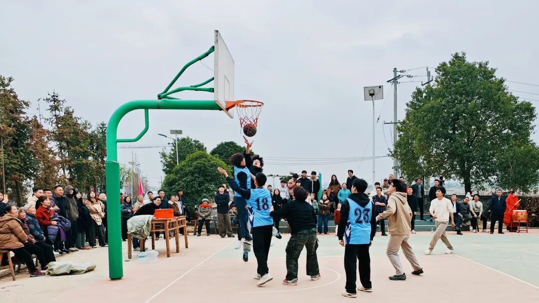 文艺演出过后,赛场的欢乐同样不减。钟溪村VS敖家村的“村BA”篮球赛激情开赛,球员们奋力拼抢,赛场边村民围得水泄不通,加油声、呐喊声震耳欲聋,输赢早已不重要,赛出的是邻里间的深厚情谊,是乡村振兴的蓬勃朝气。村嫂云芳说:“村晚有看头、有玩头、有暖头,看着节目、玩着游戏、看着比赛,这才是咱农村过年最热闹的样子,年味足足的!”