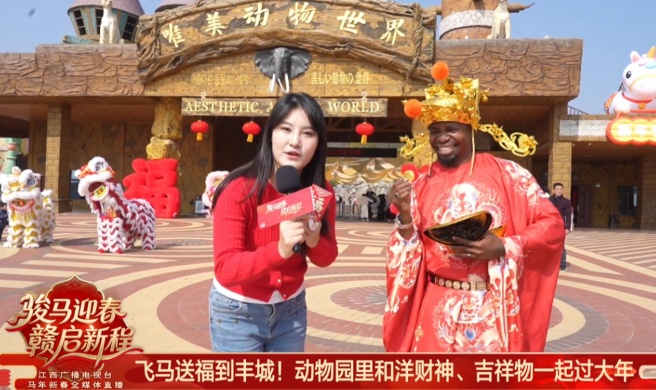 值得一提的是,春节假期,宜春丰城唯美养生谷度假景区的唯美动物世界门口,还有一位洋财神送福。