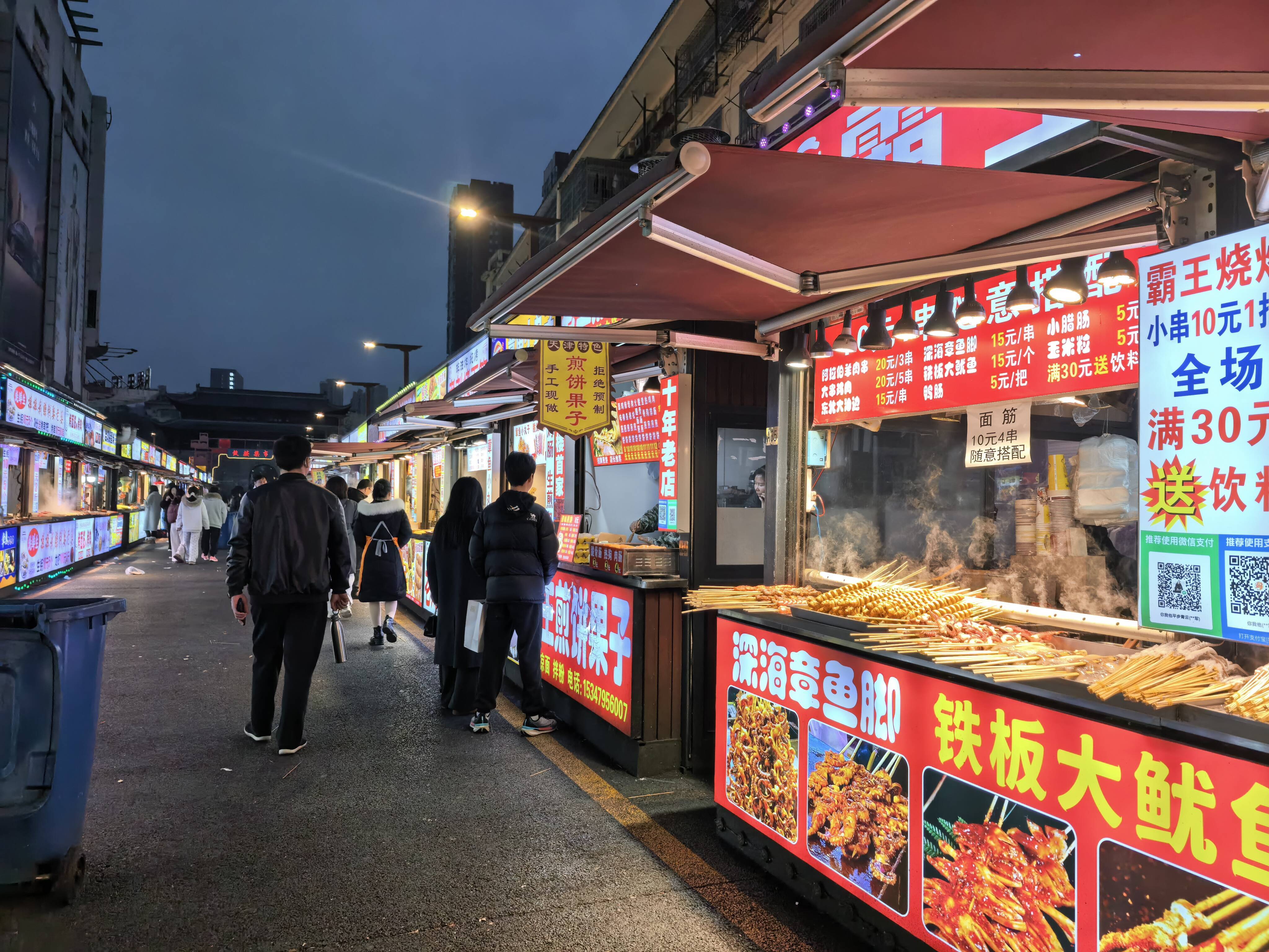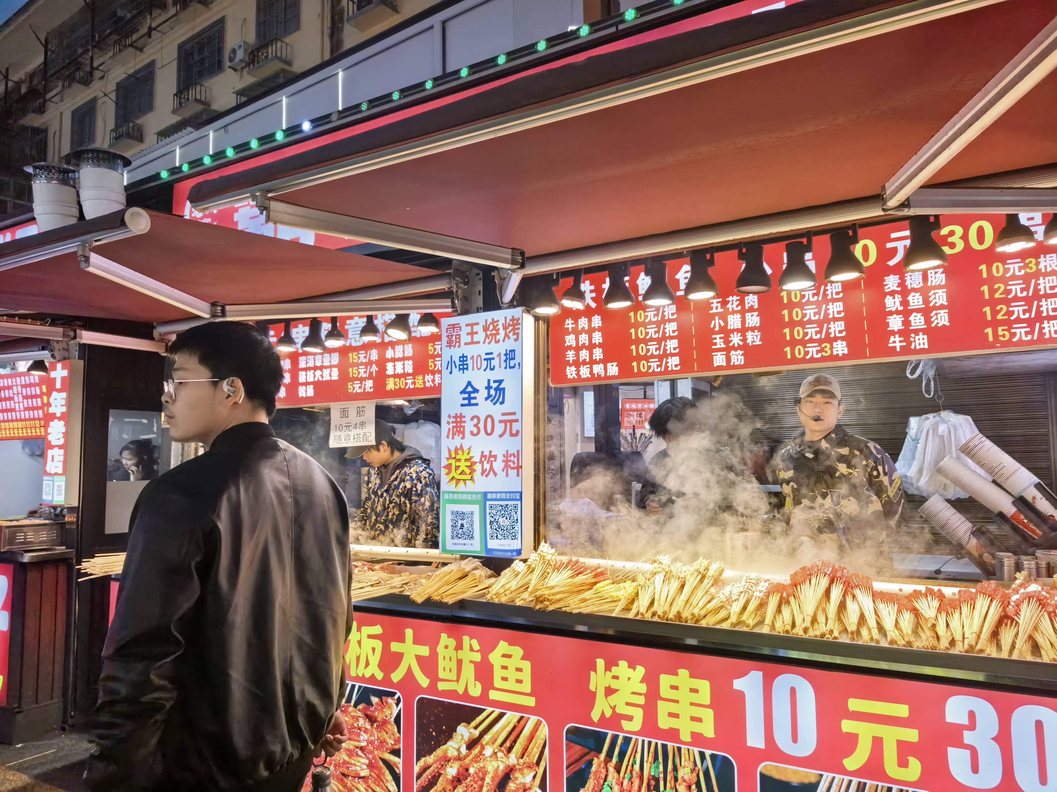 从卤味的麻辣扑鼻,到烧烤的焦香四溢,从臭豆腐的外焦里嫩,到现榨果汁的清甜解腻——几十种地方小吃与特色美食,共同构成了鼓楼独特的“舌尖地图”。人们围坐摊前,一碗热汤、几串烤肉,闲话家常中流露着一年的牵挂与团圆的温馨。