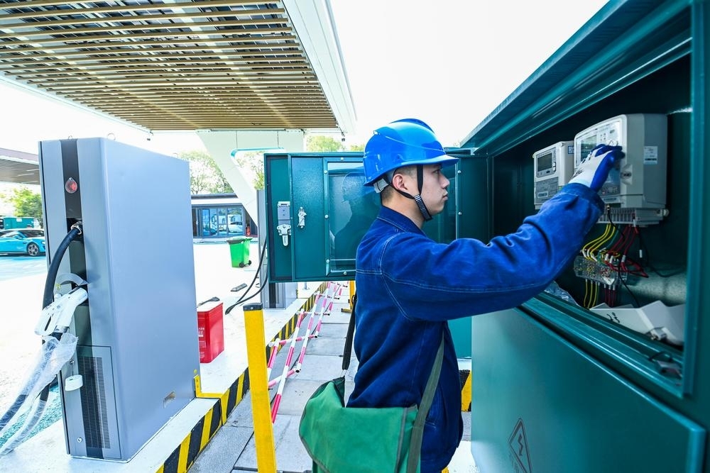 图为国网袁州区供电公司的巡检人员在查看充电设施的使用情况。(记者 周 亮 摄)