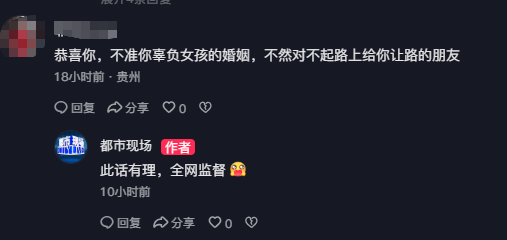 对此,有不少网友说,这场跨越千里的路程,让他们看到了爱情最纯粹的模样,在返工大潮中显得格外动人;也有网友说:“恭喜你,不准你辜负女孩的婚姻,不然对不起路上给你让路的朋友”。