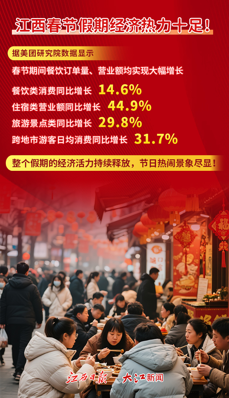 大江新闻讯 胡紫恒 全媒体记者黄健恒、魏娅璐报道:今年春节,江西消费市场热力十足!文旅出行、餐饮聚会、酒店住宿……各类服务消费火热展开。