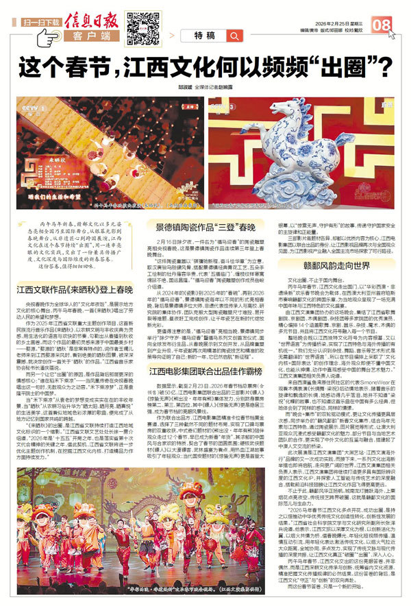 丙午马年新春,赣鄱文化以多元姿态亮相全国乃至国际舞台,从银幕光影到春晚舞台,从非遗匠心到跨国展演,江西文化在这个春节持续“出圈”,用一连串亮眼的文化实践,交出了一份兼具传播广度、文化深度与国际维度的新春答卷。