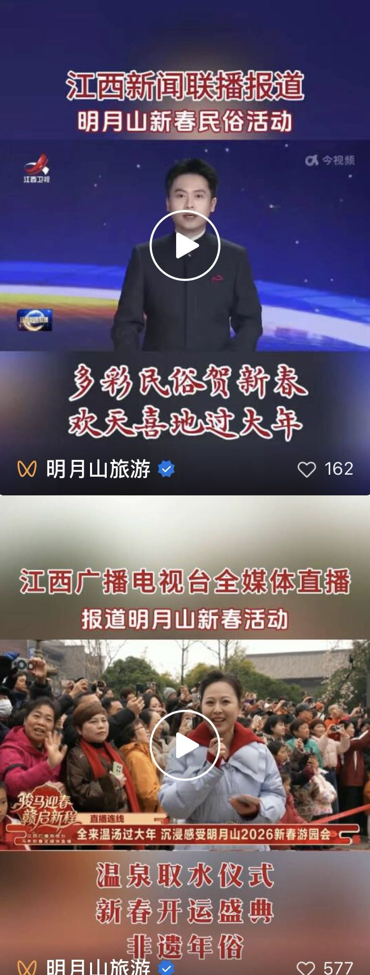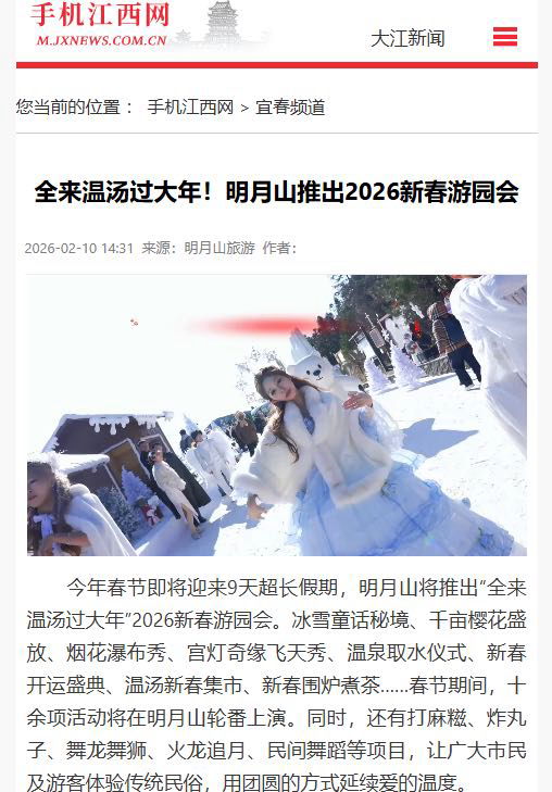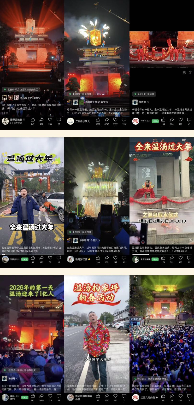 中央电视台、央视网、央视新闻客户端、人民网、人民日报、新华网、经济日报、国际在线、江西电视台、江西日报、今视频、大江新闻等20家主流媒体中报道宜春的春节宜春文旅短视频全网话题总浏览量突破3亿人次,同比2025年春节增长约45%,传播效果显著。