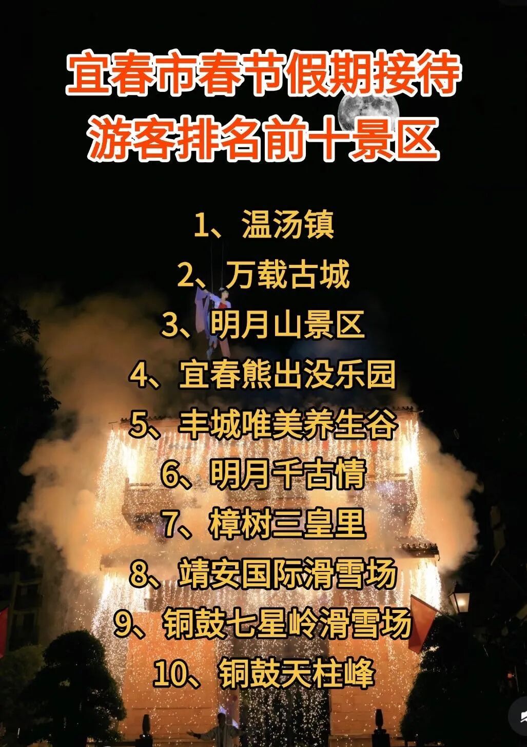 春节假期,全市举办各类文化旅游活动186场。其中,旅游活动近100场。明月山全来温汤过大年、明月山千古情新春游园会、温汤宫灯奇缘飞天秀等活动日均吸引游客超13万人次。