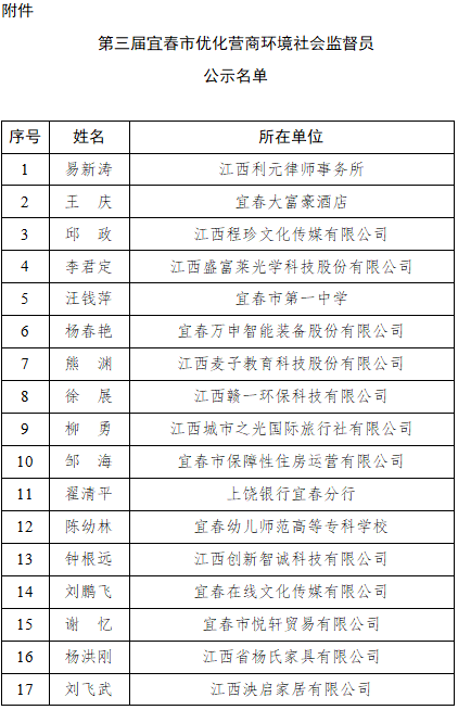 附件:第三届宜春市优化营商环境社会监督员公示名单
