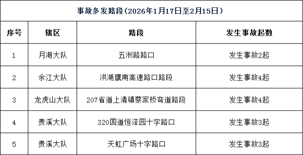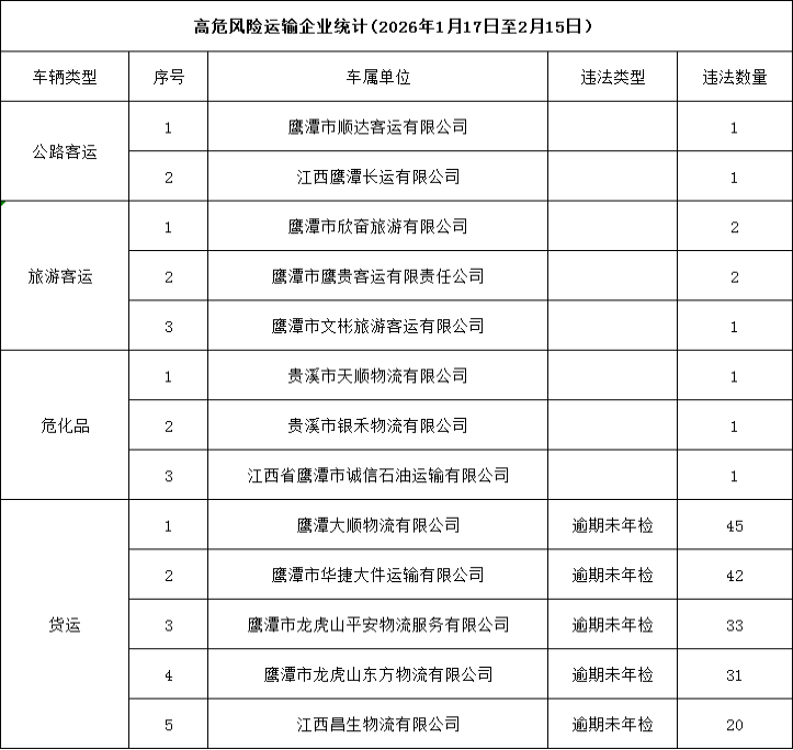 本次重点曝光2026年1月17日至2月15日的突出违法车辆、典型事故案例、事故多发路段、风险运输企业和终生禁驾人员名单(简称“五大曝光”)。