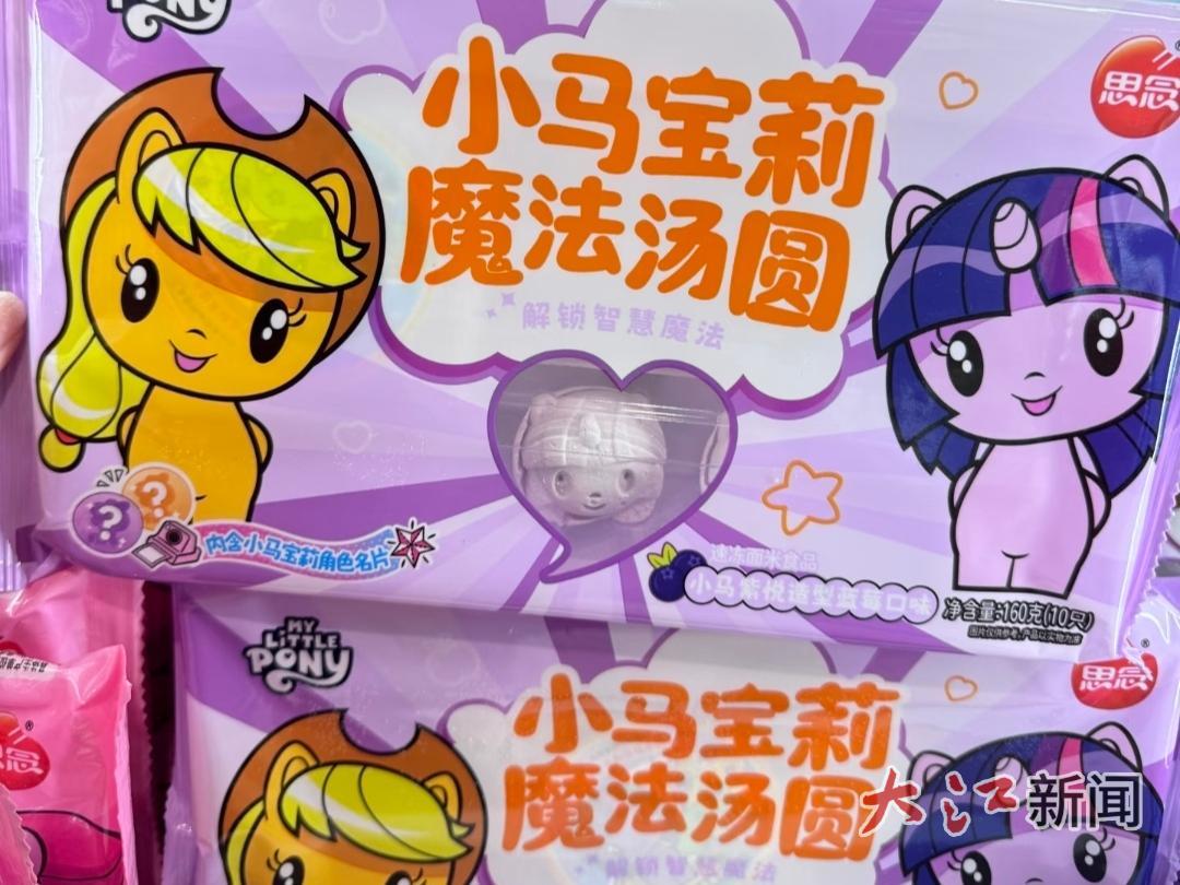 汤圆界的IP联名同样精彩,小马宝莉、蛋仔派对、小黄鸭等IP都通过和头部速冻食品品牌合作的方式推出了定制版汤圆。从外包装到汤圆造型,都加入IP元素,吸引不少年轻群体的眼球,现场还有不少带着孩子的家长主动寻找相关IP购买。