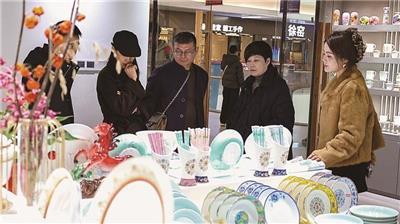 各个销售区域,琳琅满目的陶瓷产品让人目不暇接。游客们或驻足欣赏精美瓷器,或细细挑选心仪好物,或拍照打卡记录美好瞬间,欢声笑语不断。(全媒体记者 刘燕 摄)