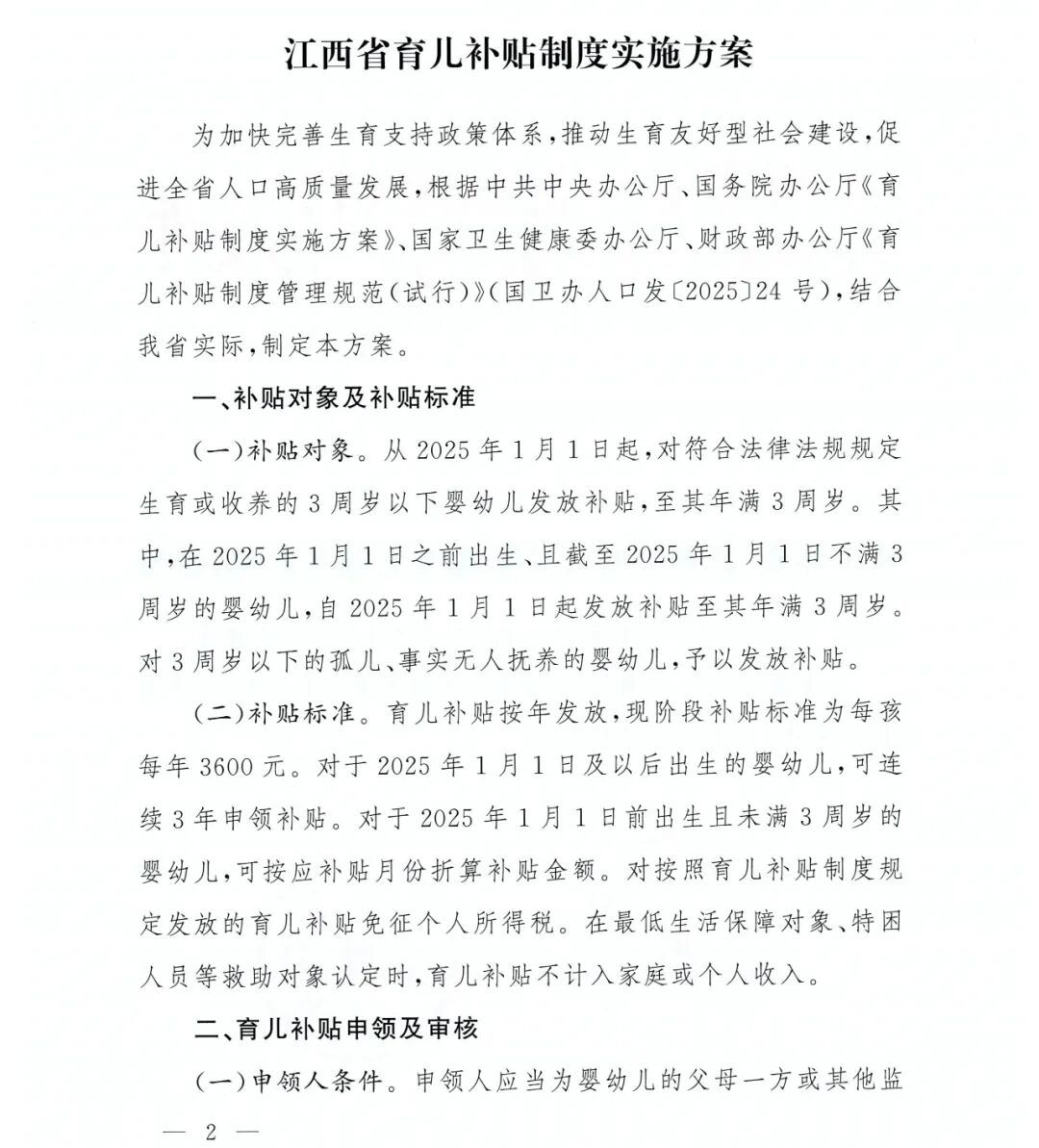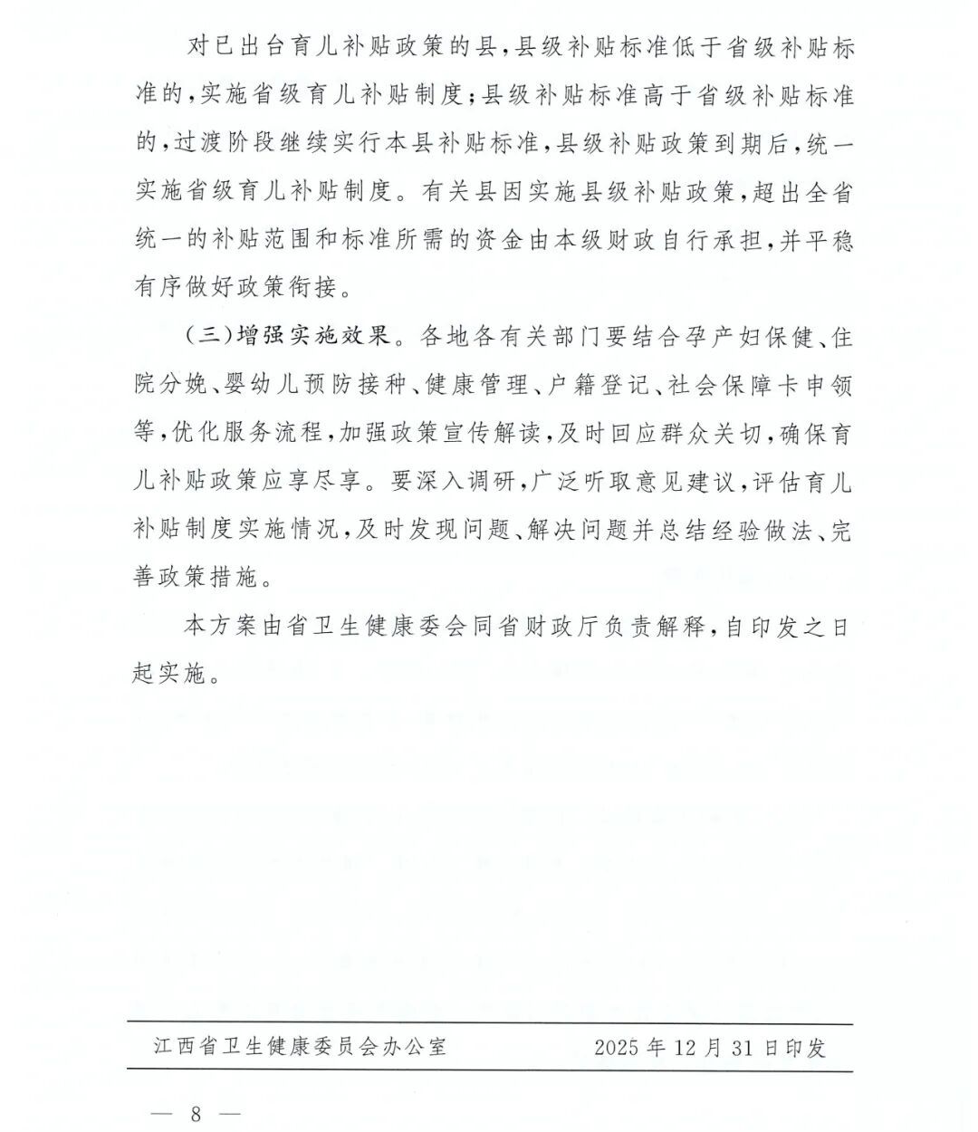 江西省育儿补贴制度实施方案