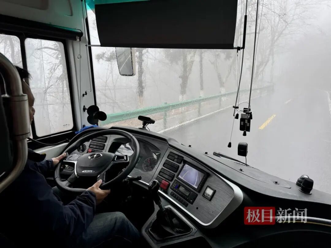 司机张师傅冷静从容地操纵着观光车,平稳驶过多个连续弯道。刚上山时,尽管下着雨,游客的视线并未受太大影响。随着观光车行驶至半山腰,车外雾气渐浓,视线开始受限。道路一侧依山,一侧则是云雾茫茫的悬崖,但张师傅依旧从容不迫,熟练会车、精准过弯,全程稳如平地。