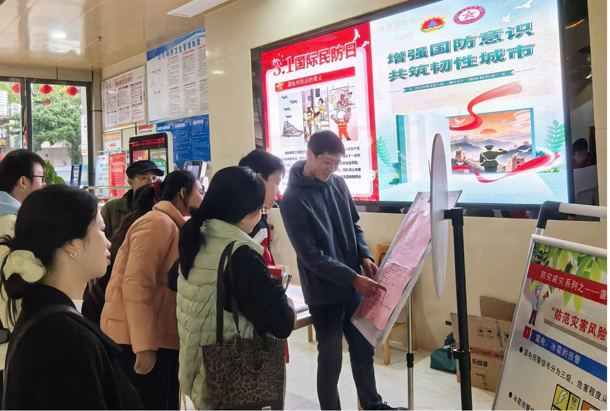 2月28日下午,市国防动员办联合蓉江新区经发局、挂点社区领悦社区开展“3·1国际民防日”主题宣传活动。活动现场,市国防动员办聚焦社区居民实际需求,通过“宣传咨询+知识宣讲+实操演练+实地参观”的多元化形式,向社区居民普及国防动员和人民防空知识。在小区廊道,工作人员设置防灾减灾咨询台,向过往居民发放国防动员法律法规及防空防灾知识读本;在领悦社区党群服务中心,工作人员用通俗易懂的语言,结合生活实际向居民讲解防空防灾常识,并通过有奖问答互动调动大家的参与热情。