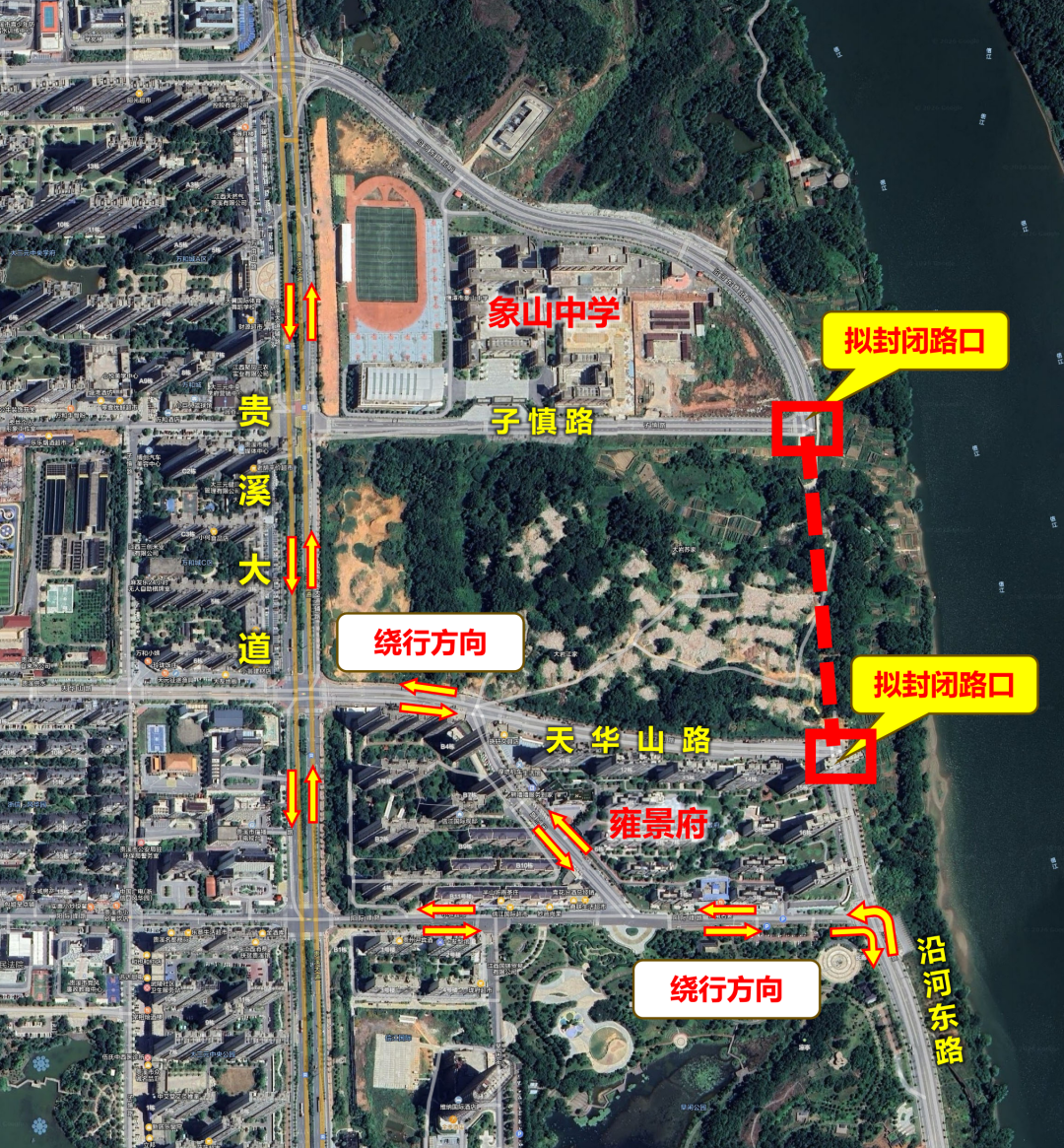 三、管制措施:施工期间将对沿河东路与子慎路交叉口、沿河东路与天华山路交叉口围挡封闭施工。