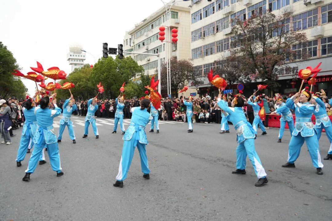 随后16个方阵依次登场,各展风姿、各具特色。长龙时而腾身而起、直冲云霄,时而衔尾嬉戏、灵动婉转。龙头灵活摆动、龙口张合有度、龙身起伏辗转、龙鳞熠熠生辉,动静之间惟妙惟肖、恍然若真。青原箍俚龙威猛霸气,峡江打蚌壳舞灵动俏皮,吉安东园龙威武雄壮、板凳龙巧妙灵动,一众非遗表演尽显吉安 “中国灯彩艺术之乡” 的绚丽多姿。“舞龙是祖辈传下来的手艺,今天我们要舞出吉安人的精气神!”吉安县方阵表演者刘峰说,“锣鼓一响,浑身是劲,这红火的场面一铺开,咱吉安人的精气神儿就跟着鼓点上来了,这一年我们更要撸起袖子加油干!”