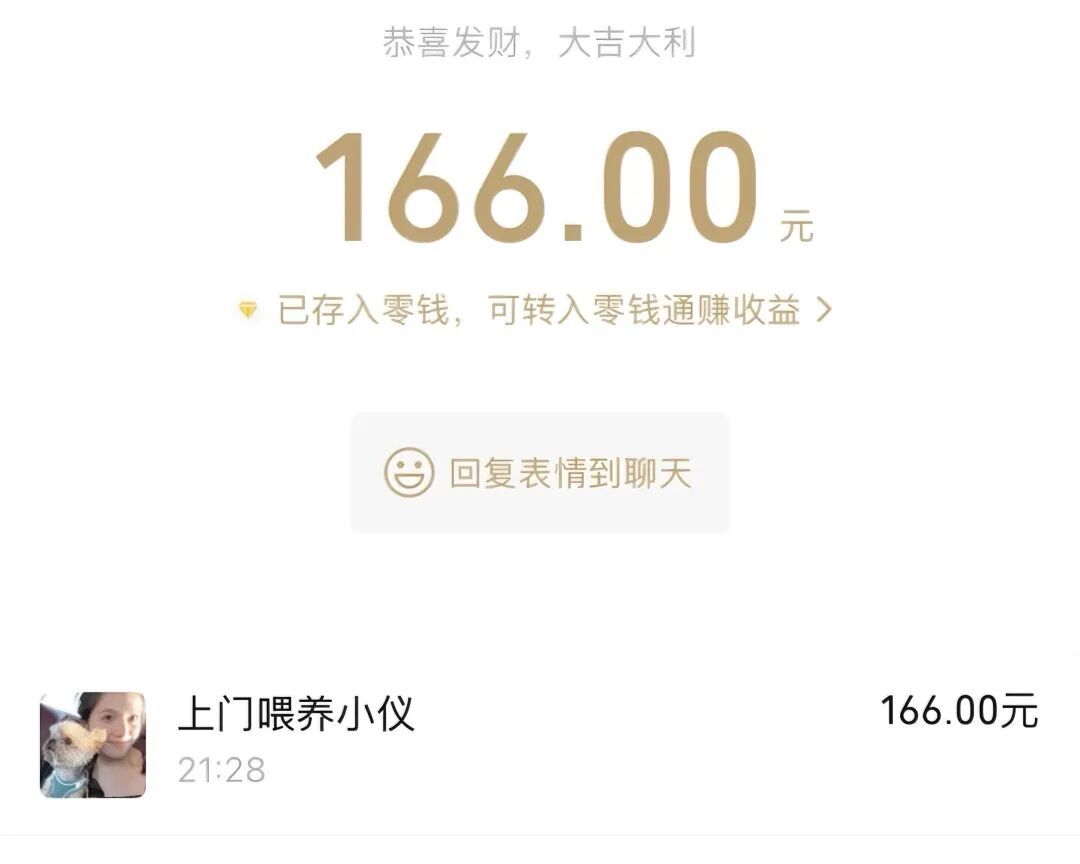 去年刚大学毕业的小仪,尝试过十多种工作,曾短暂地“躺平”。转折点发生在去年国庆,她在社交平台刷到上门喂养的信息,抱着“喜欢动物”和“赚点饭钱”的心态开始尝试。最初,她甚至“为爱发电”——遛狗半小时收费10元,往返途中骑共享单车花5元,一单只能赚到5元。