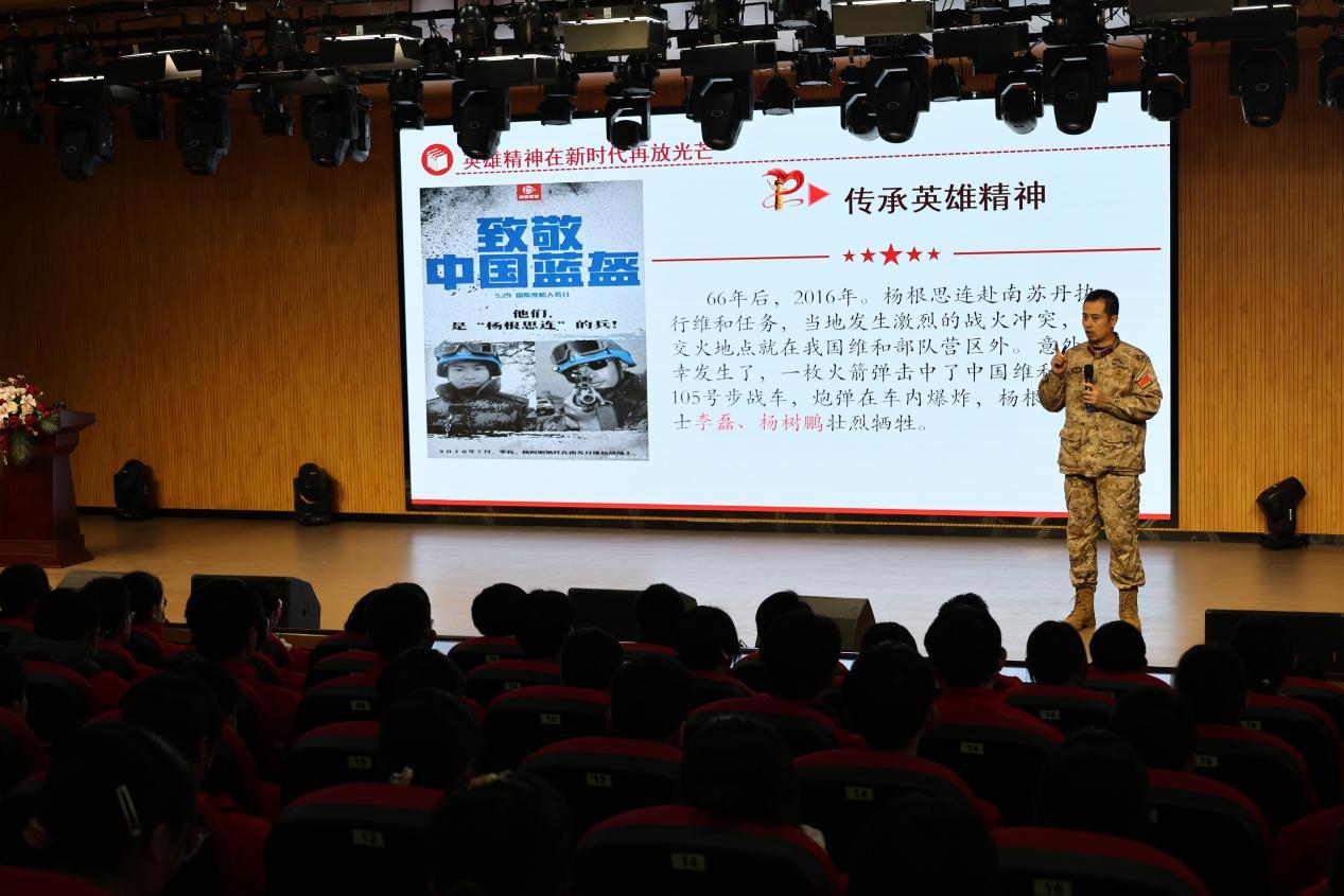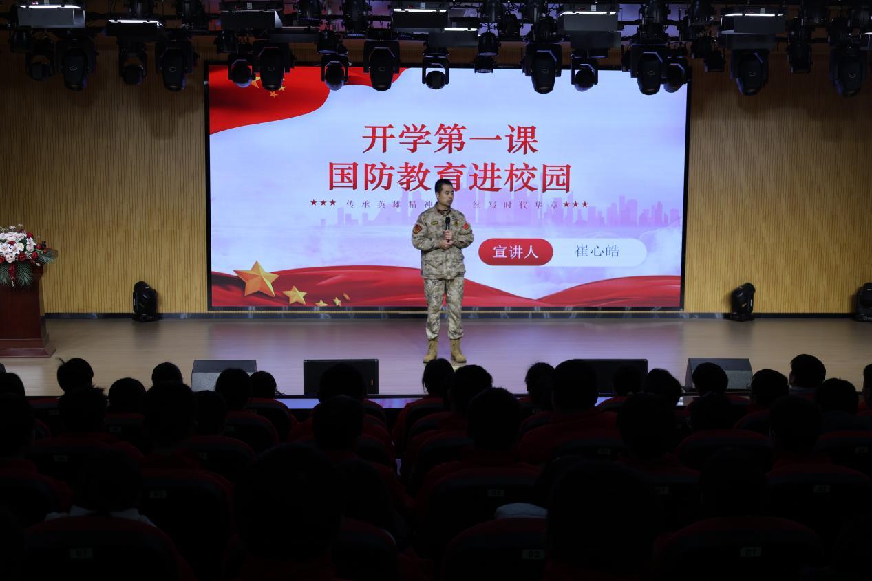 崔心皓用亲身经历的故事串联起国防知识。他讲述了三军仪仗队在恶劣天气中依然保持完美队列的经历,分享了训练场上“踢正步踢到腿发麻,站军姿站到汗水浸透礼服”的日常,还展示了当年仪仗队训练的照片。“每一个动作背后,都是千锤百炼,都是为了在全世界面前展示中国军人的风采。”台下,同学们听得着迷、看得入神。