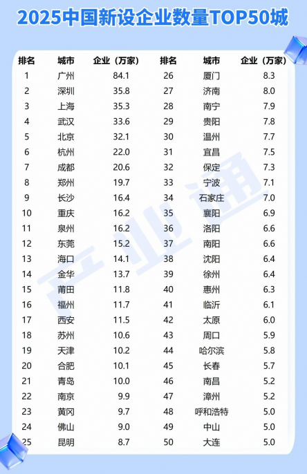 还值得关注的是,南昌成功入围《2025中国新设企业数量TOP50城》,这标志着,市场主体培育进入提质阶段!南昌以5.2万家新设企业位列第46位,增速稳定,彰显出“稳主体、扩增量”的政策优势。