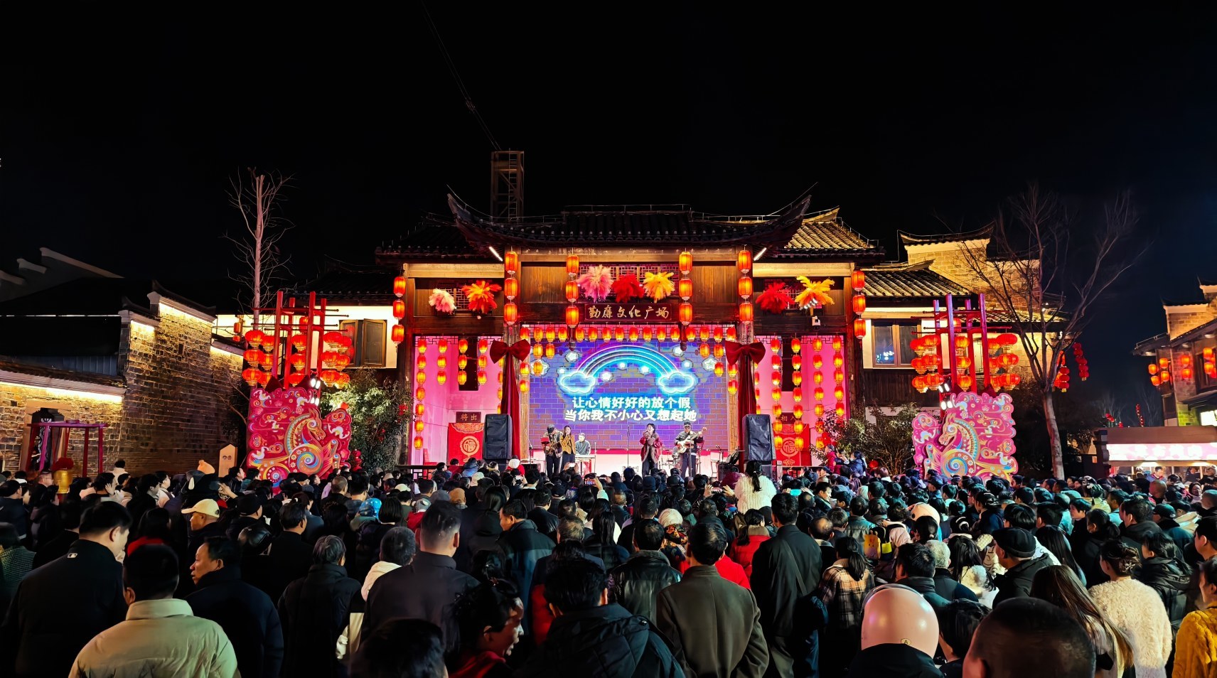 景区内大红灯笼高挂,花灯璀璨,处处洋溢着喜庆氛围。猜灯谜是最受欢迎的传统项目之一,缀满灯谜的玫瑰长廊上人头攒动,兑奖处热闹非凡。民宿小广场上同样热闹非凡,彩色元宵 DIY、夹元宵挑战赛、巧手制花灯等趣味游园活动吸引众多游人争相体验,现场欢声笑语不断。