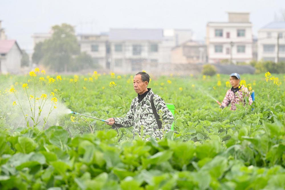 近日,袁州区彬江镇三星村,村民正在为油菜喷施防冻剂。眼下正是油菜田间管理的关键时期,该区各乡镇农民抢抓农时,加紧进行防冻、除草、施肥等农事作业,为油菜丰产增收打好基础。 (本报记者 李亦杰 摄)