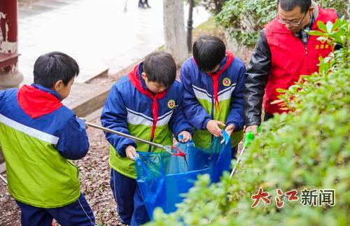3月4日,在南丰县琴湖公园,子固小学的小志愿者们在清理垃圾。当日,南丰县子固小学学生们走出校园来到街头、公园,清洁公共设施和周边环境,以义务劳动的形式弘扬和传承雷锋精神。通讯员谢东摄