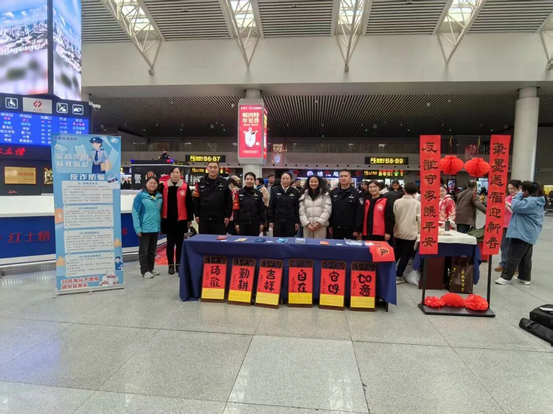 线下宣防精准发力,把安全送到群众身边。人流密集处,便是反诈宣传的主阵地。省厅反诈中心联合省妇联,在南昌火车站举办“笔墨送福迎新春 反诈守家护平安”主题活动,民警现场书写反诈春联,将祝福与安全一同送到返乡群众手中。厅机场公安局充分利用航站楼显示屏,打造反诈宣传矩阵,重点提醒乘客防范机票退改签诈骗。