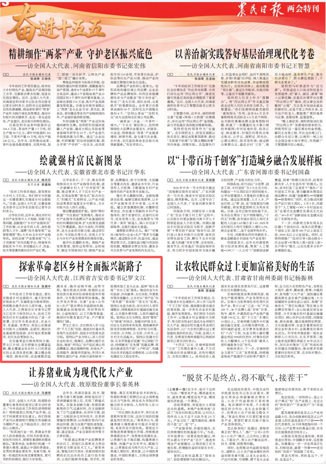 《农民日报》两会特刊单篇报道《探索革命老区乡村全面振兴新路子——访全国人大代表、江西省吉安市委书记罗文江》。