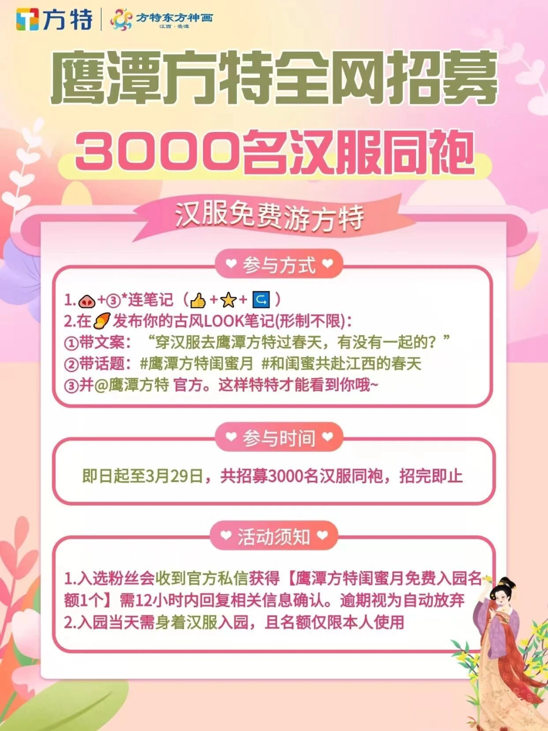 划重点:本月鹰潭方特推出穿汉服免费游玩活动,不论男女老少,皆可参与!!!名额有限,赶紧参加!!!