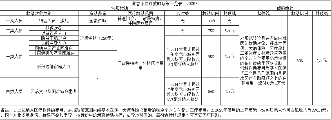 为切实兜住兜牢基本民生保障底线,让困难群众“病有所医、医有所保”,现将2026年宜春市医疗救助政策梳理汇总。本次政策按救助对象类别细化了资助参保、常规救助及倾斜救助标准,清晰明确了救助范围、起付线、救助比例与封顶线等关键信息,方便大家快速查询、精准享受政策红利。以下为政策一览表,供广大群众了解: