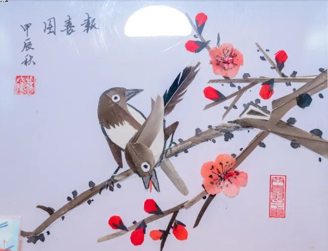 羽毛画作为共青城的非遗技艺,让人惊叹不已。一片片普通的羽毛,经过巧手粘贴,变成栩栩如生的花鸟山水,不少市民驻足欣赏,连连称奇。
