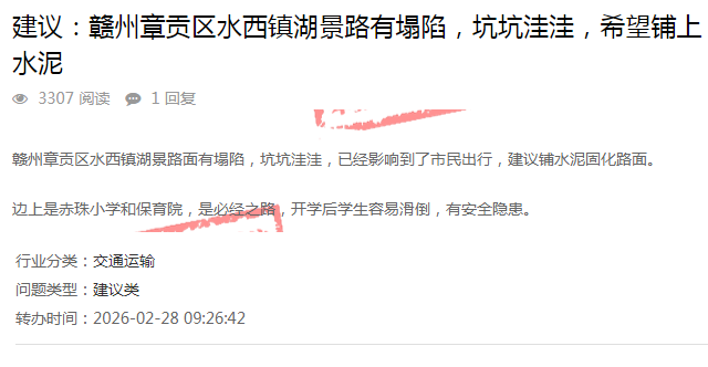 章贡区水西镇湖景路面有塌陷,坑坑洼洼,已经影响到了市民出行,建议铺水泥固化路面。边上是赤珠小学和保育院,是必经之路,开学后学生容易滑倒,有安全隐患。