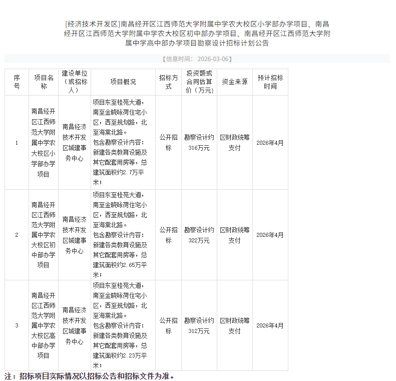 3月12日,记者从江西省公共资源交易平台获悉,该平台发布了南昌经开区江西师范大学附属中学农大校区小学部、初中部、高中部办学项目勘察设计招标计划公告,三个学部具体位置同步明确。预计招标时间为2026年4月。