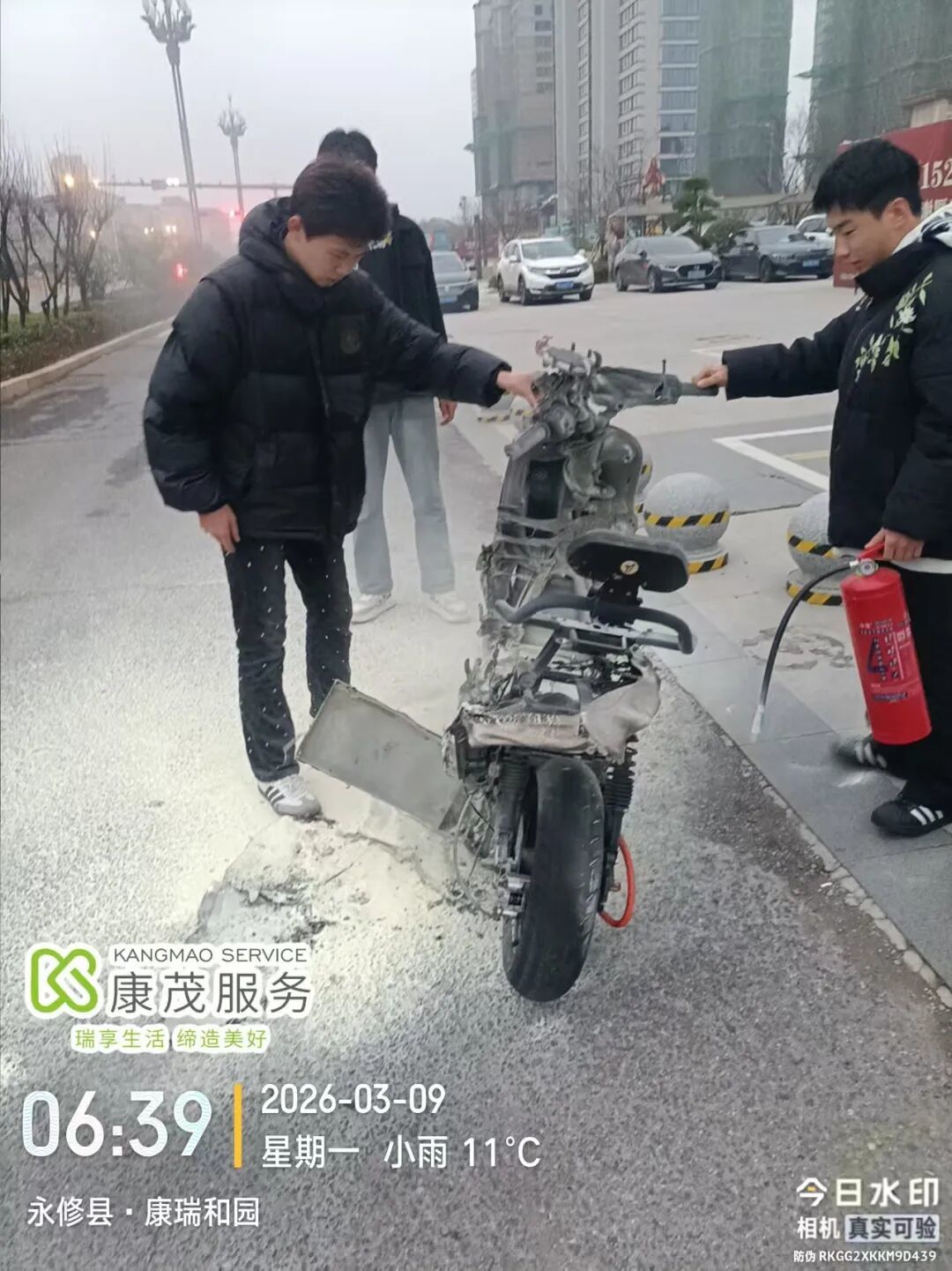 发现险情后,电动车驾驶员第一时间下车查看,随即快步前往附近小区保安室寻找灭火器材。正在值班的保安戴昌祖得知火情后,立即携带一罐灭火器跟随驾驶员赶赴现场。