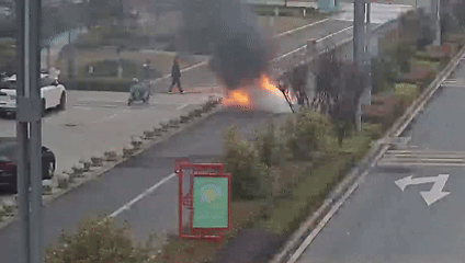 据现场监控画面显示:当日清晨6时32分一辆电动车行驶至康瑞和园小区北门口路边停下,后座人员刚下车,车辆底部便突然冒出浓烟,紧接着明火迅速燃起,火势顺着车身快速蔓延,情况十分紧急。