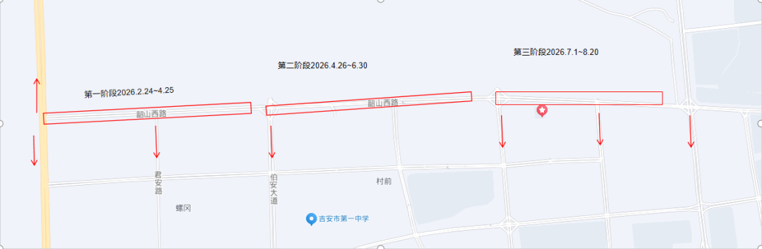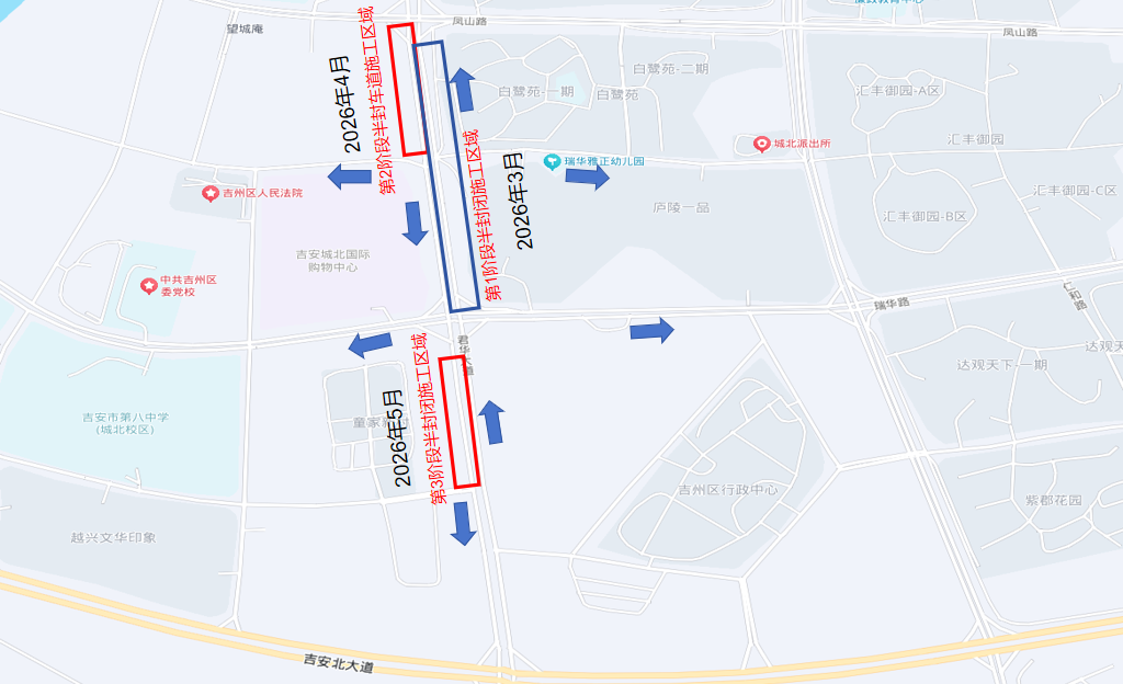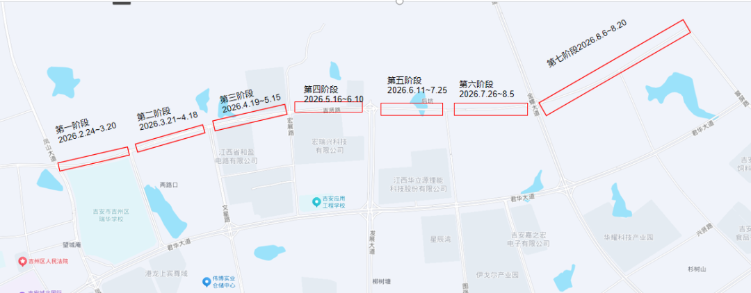 2.吉州大道(阳明西路-井冈山大道)双向六车道实施辅道半幅封闭施工。