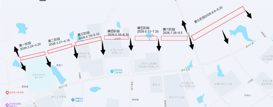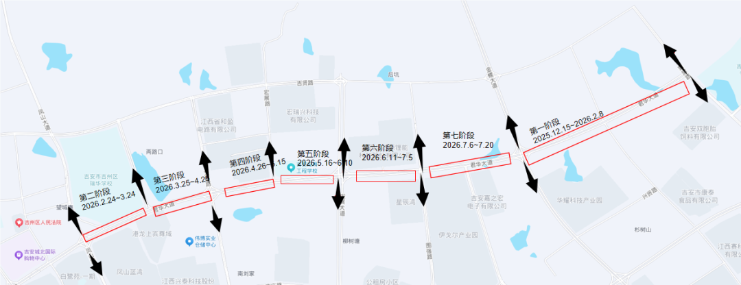 1. 正丙角路(君华大道-吉州大道)双向两车道实施分段半幅/封闭施工。
