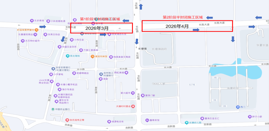 24.长兴路(长运大道-新村路)为双向两车道,实施主道全幅封闭施工。
