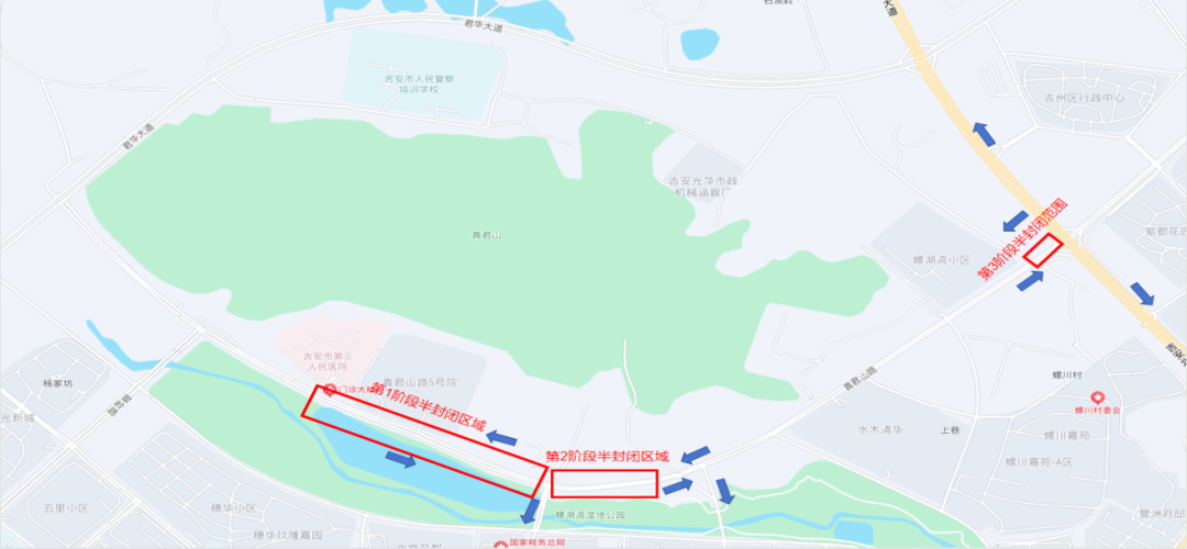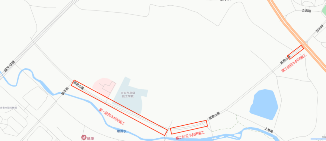 17.真君山路(君华大道-吉安北大道)双向四车道,实施主道半幅封闭施工。