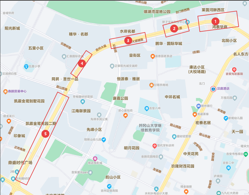 线路一:君华大道→翠屏路(主道)→井冈山北大道→金螺大道