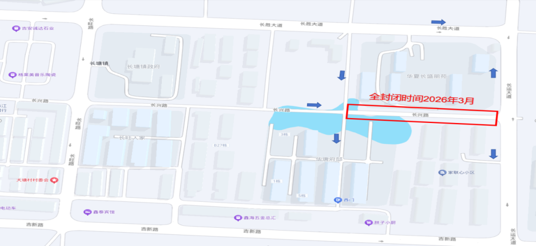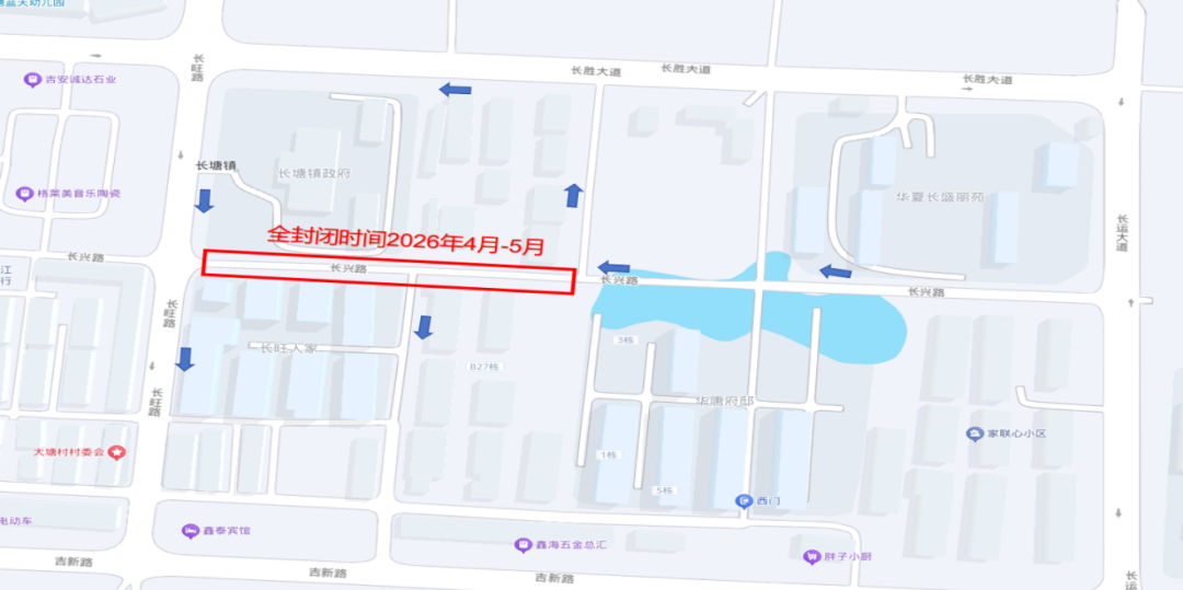 长兴路封闭期间,车辆及行人禁止通行,绕道周边道路行驶。