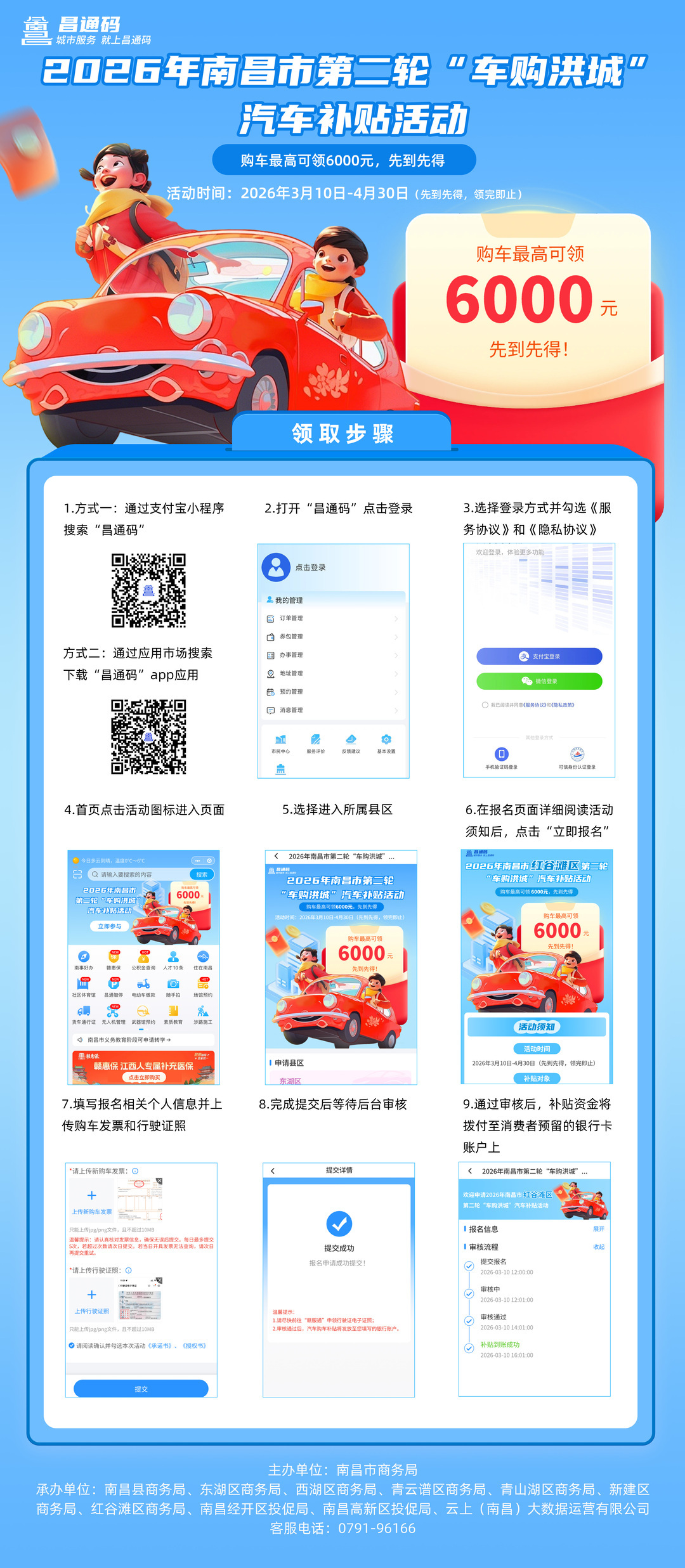 符合条件的消费者可登录“昌通码”服务平台活动专区进行申报,按要求填写并上传购车发票、新车登记证书及本人银行卡信息等材料,并签署诚信承诺书。平台将按照申请提交顺序进行审核,审核通过后,补贴资金将按程序拨付至消费者本人银行卡账户。