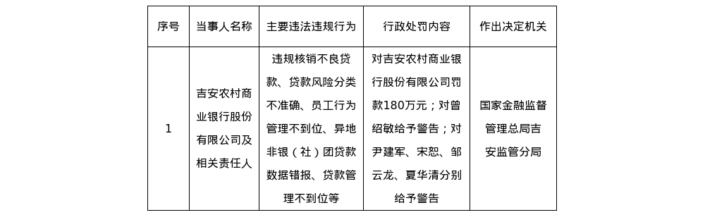 针对上述违法违规行为,国家金融监督管理总局吉安监管分局对吉安农商行罚款180万元;对曾绍敏给予警告;对尹建军、宋恕、邹云龙、夏华清分别给予警告并罚款共计24万元;对戴海峰取消高级管理人员任职资格1年。