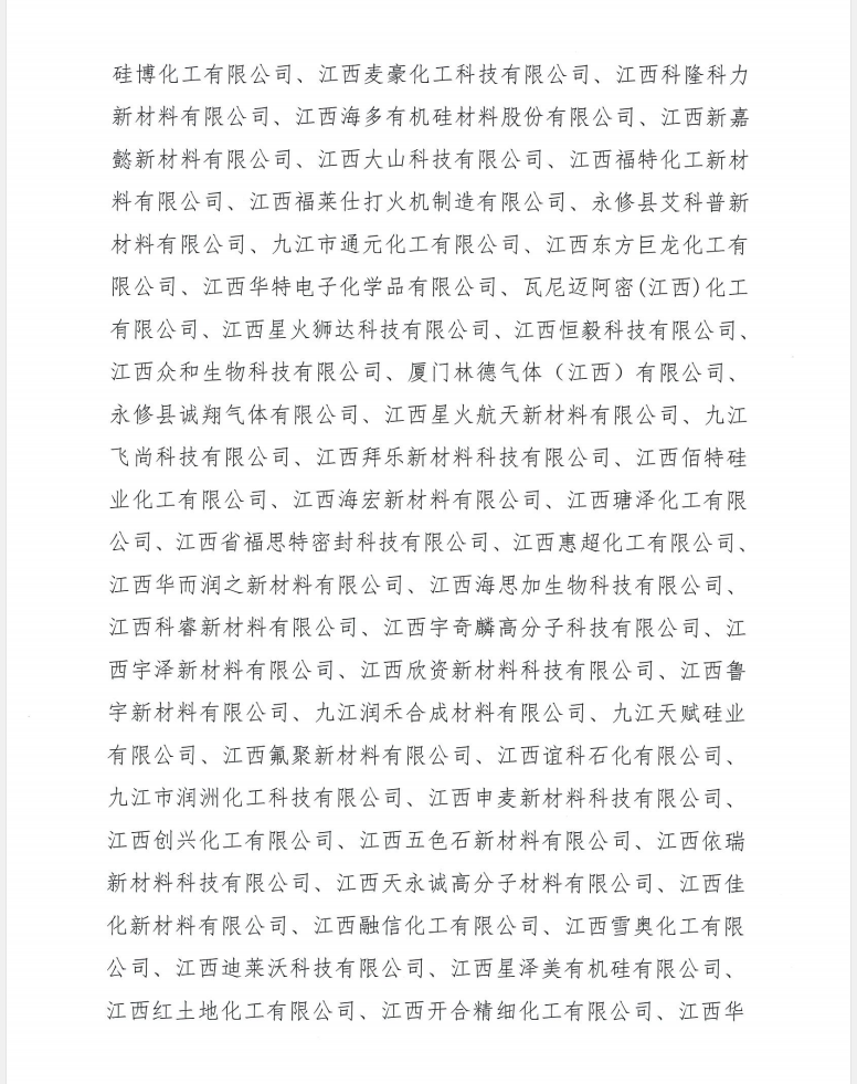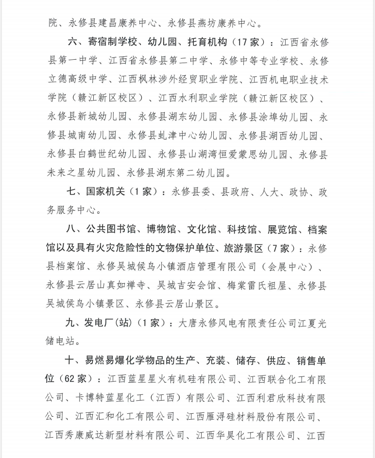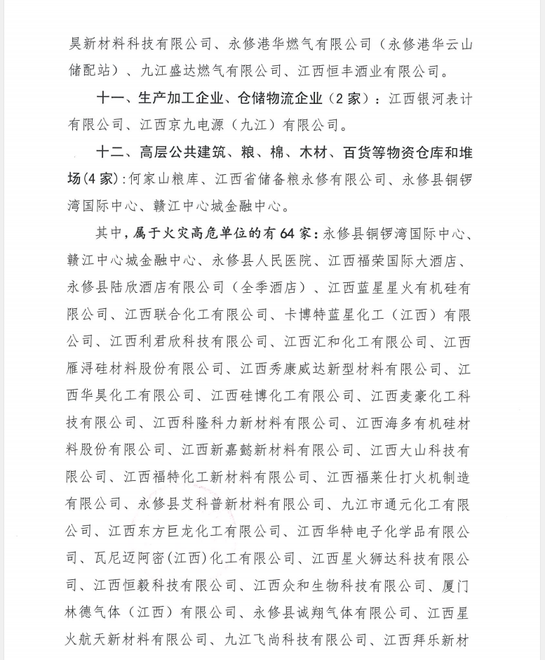 十、易燃易爆化学物品的生产、充装、储存、供应、销售单位(62家):江西蓝星星火有机硅有限公司、江西联合化工有限公司、卡博特蓝星化工(江西)有限公司、江西利君欣科技有限公司、江西汇和化工有限公司、江西雁浔硅材料股份有限公司、江西秀康威达新型材料有限公司、江西华昊化工有限公司、江西硅博化工有限公司、江西麦豪化工科技有限公司、江西科隆科力新材料有限公司、江西海多有机硅材料股份有限公司、江西新嘉懿新材料有限公司、江西大山科技有限公司、江西福特化工新材料有限公司、江西福莱仕打火机制造有限公司、永修县艾科普新材料有限公司、九江市通元化工有限公司、江西东方巨龙化工有限公司、江西华特电子化学品有限公司、瓦尼迈阿密(江西)化工有限公司、江西星火狮达科技有限公司、江西恒毅科技有限公司、江西众和生物科技有限公司、厦门林德气体(江西)有限公司、永修县诚翔气体有限公司、江西星火航天新材料有限公司、九江飞尚科技有限公司、江西拜乐新材料科技有限公司、江西佰特硅业化工有限公司、江西海宏新材料有限公司、江西瑭泽化工有限公司、江西省福思特密封科技有限公司、江西惠超化工有限公司、江西华而润之新材料有限公司、江西海思加生物科技有限公司、江西科睿新材料有限公司、江西宇奇麟高分子科技有限公司、江西宇泽新材料有限公司、江西欣资新材料科技有限公司、江西鲁宇新材料有限公司、九江润禾合成材料有限公司、九江天赋硅业有限公司、江西氟聚新材料有限公司、江西谊科石化有限公司、九江市润洲化工科技有限公司、江西申麦新材料科技有限公司、江西创兴化工有限公司、江西五色石新材料有限公司、江西依瑞新材料科技有限公司、江西天永诚高分子材料有限公司、江西佳化新材料有限公司、江西融信化工有限公司、江西雪奥化工有限公司、江西迪莱沃科技有限公司、江西星泽美有机硅有限公司、江西红土地化工有限公司、江西开合精细化工有限公司、江西华昊新材料科技有限公司、永修港华燃气有限公司(永修港华云山储配站)、九江盛达燃气有限公司、江西恒丰酒业有限公司。
